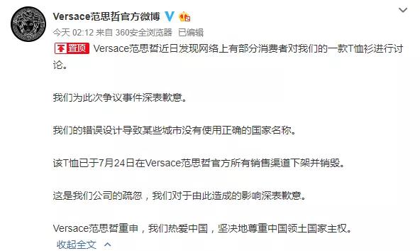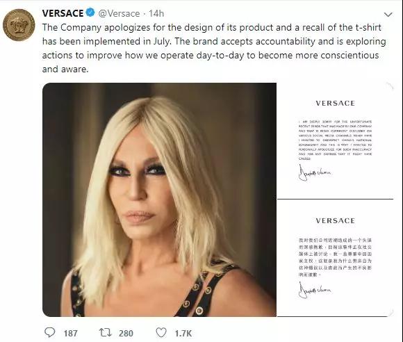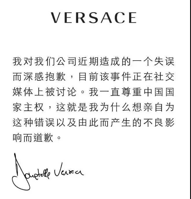 2019年8月11日下午5点,范思哲家族二代掌门人Donatella Versace亲自道歉,表示尊重中国国家主权,这次吸取了教训,中英双版,微博、Facebook、Twitter同步发布。