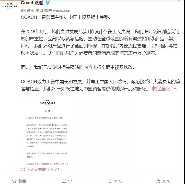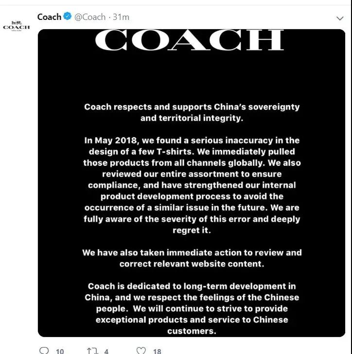 2019年8月12日下午2:40,Coach的官方微博也发表了道歉声明,表示一贯尊重并维护中国主权及领土完整,在全球范围内主动下架所有涉事商品。
