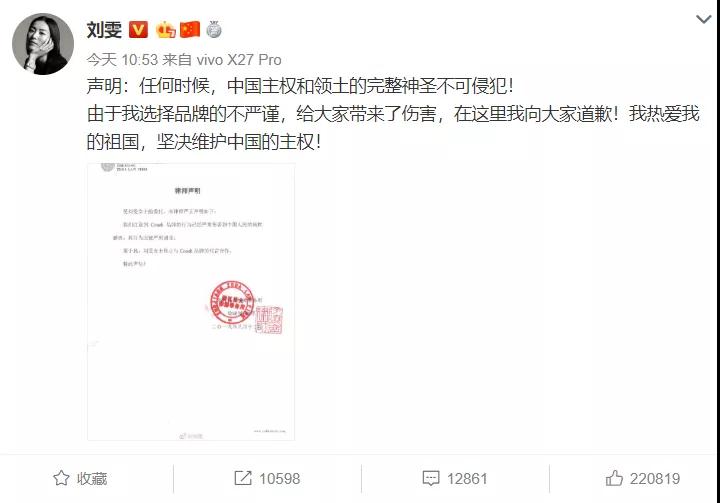 上午10:53,Coach中国代言人刘雯率先官宣,中国主权和领土的完整神圣不可侵犯!与品牌划清界限!
