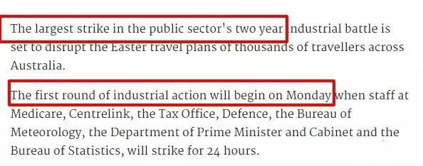 澳大利亚全国大罢工又开始了!昨天是第一波:医疗保险、福利署、税务局、国防部、气象局、总理和内阁等政府职工罢工了24小时;而在本周四的时候,澳洲移民局和边境保护局也将罢工24小时!