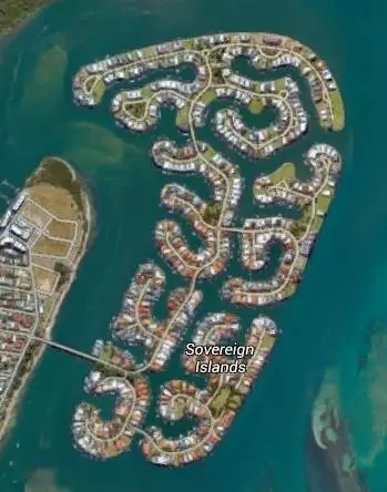 大家可以看得到,这条河也是一路弯弯曲曲,环抱有情。故大家可以看得到, Hope Island, Paradise Point, Runaway Bay 等等地方,都是发展得比较好的地方。而其中的那个岛中岛,就像是一颗明珠在这个海湾的中间,那就是 Sovereign Islands,所谓的帝王岛了。
