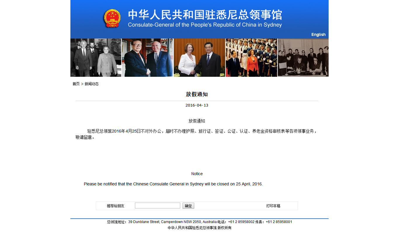 中国驻悉尼领事馆4月25日要放假,小伙伴们要办事的话记得避开这一天哦。