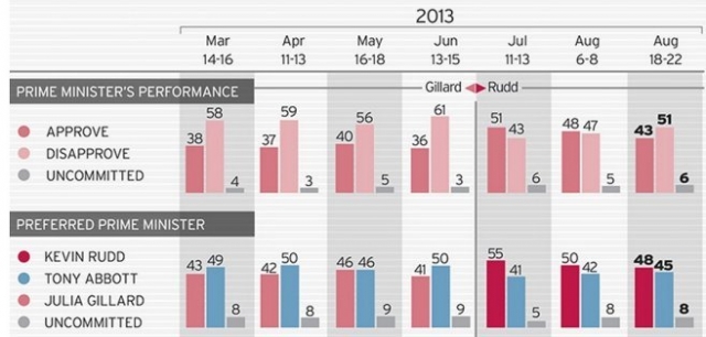 据《悉尼晨锋报》报道,由于工党支持率急剧下滑,且在总理首选人问题上,两党领袖的支持率几乎打成平手,反对党领袖艾伯特(Tony Abbott)极有可能成为第29任澳洲总理。