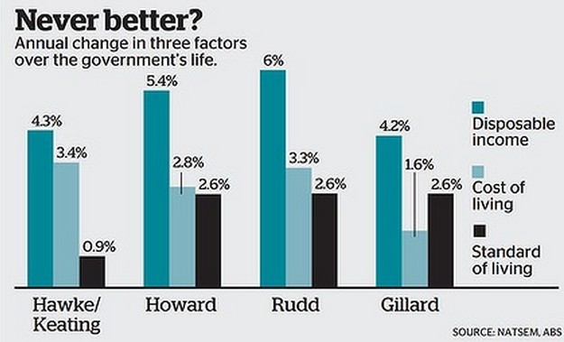 在陆克文的首届任期,生活成本每年增加3.3%,不过同期内澳洲家庭的可支配收入也提高了6%。而在吉拉德的任期(2010年到2013年6月份),生活成本仅微增1.6%,可支配收入提升了4.2%。
