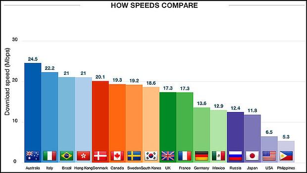 英国公司OpenSignal公布的《2014年长期演进技术状况》(State of LTE 2014)报告显示,澳洲在全球4G下载速度上排名第一。这一数据来源于全球安装了该公司Android和iPhone应用的600台4G移动设备。报告指出,澳洲4G网络的平均下载速度是每秒24.5Mbps,稍领先于意大利、巴西及香港,这三个地区的4G网络下载速度在每秒21-22Mbps之间。