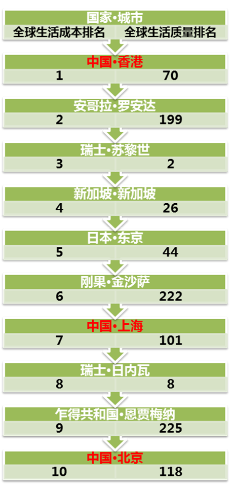 这项最新年度调查显示,部分亚洲城市的生活成本不低于西方城市。在排名前10的城市中,亚洲城市占半数名额。香港挤下去年冠军罗安达,上海和北京分列第7和第10位。