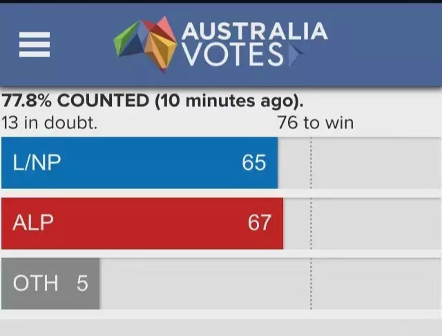 目前已经统计77.6%的选票,自由党又被工党领先,澳洲的选票统计结果也是让大多数人醉了,变来变去,没人能够确定大选的最终结果。就连澳洲广播公司分析师Antony Green都表示,自己无法确定最终结果。