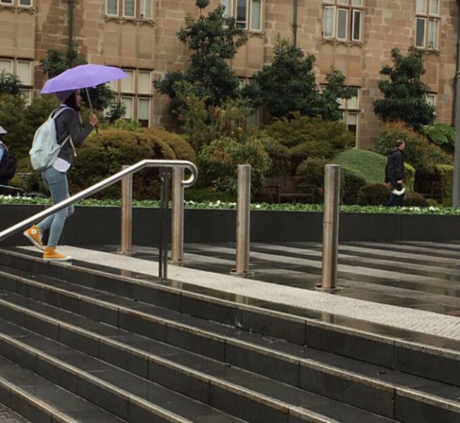 昨天,有网友爆料称,悉尼大学的校园内正在拍摄一部中国电影,附近的人群都被疏散。而且,网友还拍到了一名撑着紫伞的女演员。