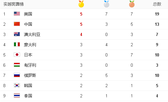 最后这是今天的奖牌排行榜!中国队,棒棒哒!