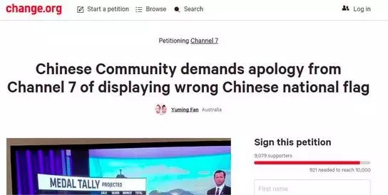 然并卵,澳洲电视七台的这两个转播失误激怒了众多在澳华人华侨,有网民在网上发起签名请愿,要求电视七台对弄错中国国旗道歉,目前已收到9000多人的支持。