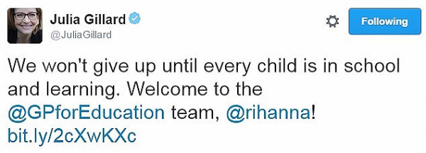 【今日澳洲6月8日讯】本周澳洲前总理吉拉德(Julia Gillard)和美国流行歌手蕾哈娜(Rihanna),1月份出访非洲国家马拉维的视频曝光,据悉他们要在2018年到2020年间筹集31亿资金,帮助提高发展中国家的教育质量。