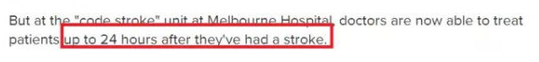 而现在,澳洲科研人员取得的新突破就是,能够将中风的有效抢救时间最长延长至24小时!也就是说,中风患者在24小时之内接受治疗,都有机会康复,而且,大多数患者在治疗后没有任何副作用。