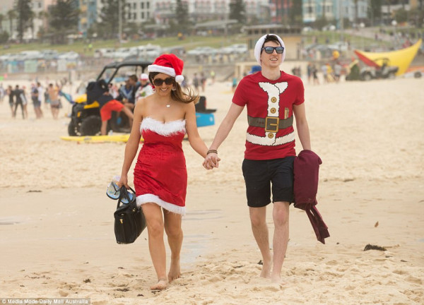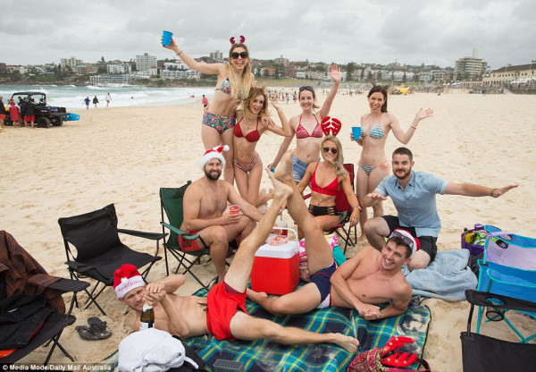 一些游客甚至把圣诞晚餐带到沙滩上,他们铺上野餐垫,或坐在从家里带来的躺椅上,尽情享用大餐。
