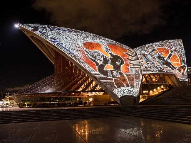 每晚日落时分和晚9点,悉尼歌剧院都会用7分钟的光影,讲述古老原住民的故事。
