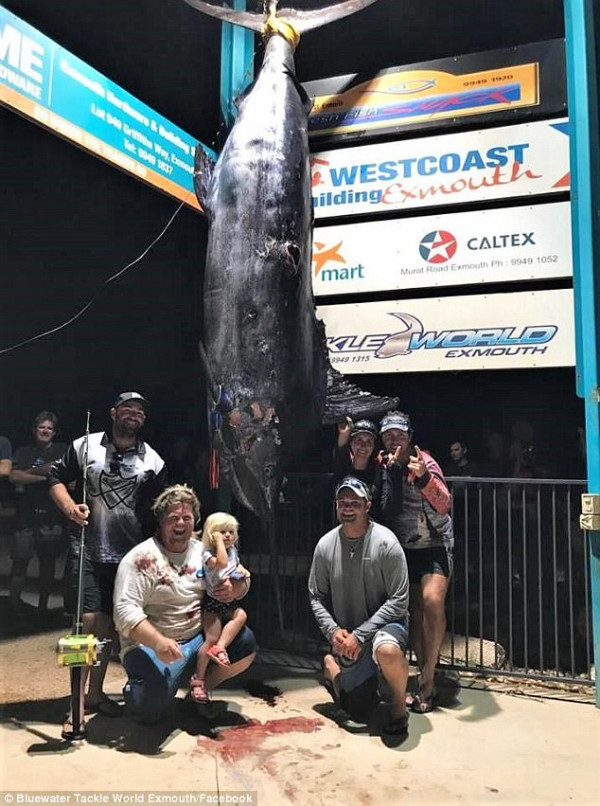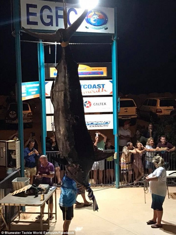 周一晚上,Exmouth钓鱼俱乐部的500多人前来围观这条蓝枪鱼,并合影留念。Hilbert称:“隔天我才感到自己的腰背很痛,但是我很兴奋,能够钓到这么大的鱼,真是难以置信。”Hilbert称这条鱼将被用于科学研究,在正式称重后将送往珀斯。
