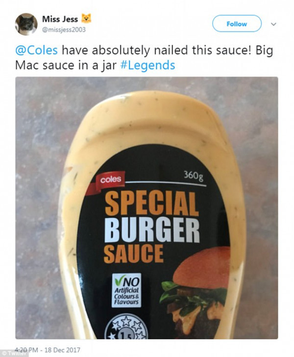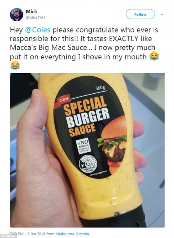 众网友发推称,“再也不需要巨无霸酱汁,感谢@Coles”、“@Coles击败了对方!瓶装巨无霸酱汁”,“@Coles味道几乎和麦当劳的巨无霸酱汁一样”。