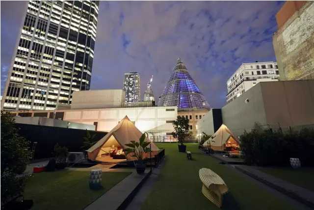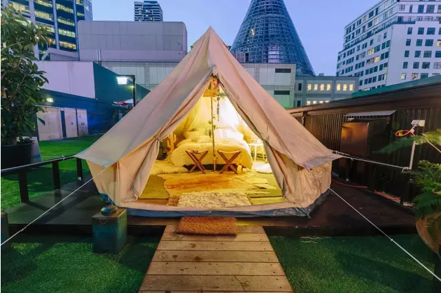 Melbourne Central 商场天台的高级露营酒店,终于可以睡在商场里了呢!帐篷以五星级防水布为材料,分两种,一种是4米,另一种是5米,5米大的帐幕还配备有Mini Bar,免费提供葡萄酒集团TWE 的红酒。全酒店共有30间帐篷分布在天台上,与其说像是露营,更像是一种别样的“睡大街”体验。情侣入住很有趣呢!