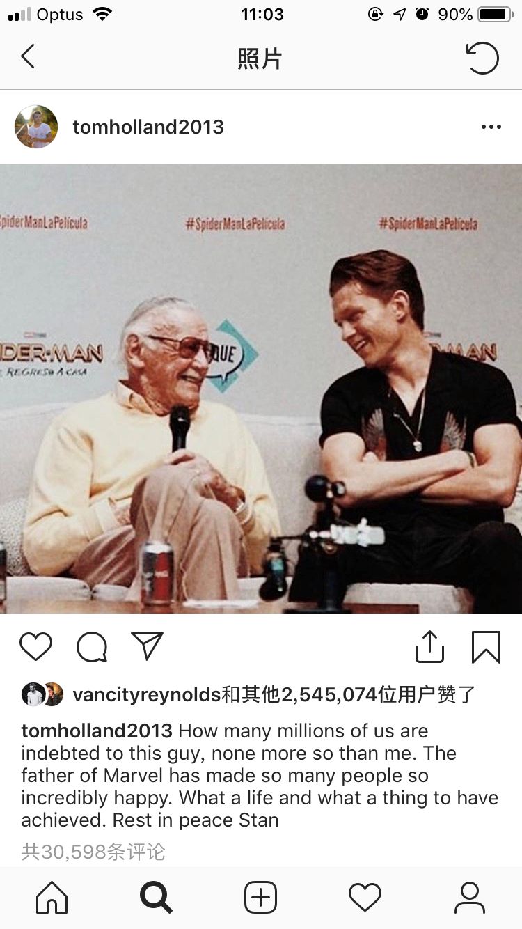 还有他最宠爱的“小蜘蛛”,也第一时间在ins上发了一整段长文,悼念“漫威之父”