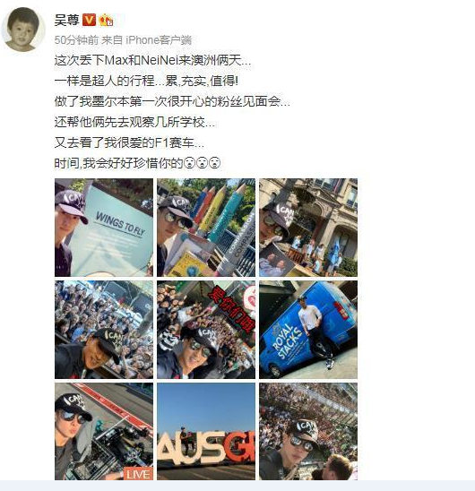 艺人吴尊17日晒出照片,透露到澳洲2天举行粉丝见面会,所到之处都吸引粉丝追星。他行程满档,贴文透露「帮他俩先去观察几所学校」,引来网友好奇:「要送NeiNei和Max出国留学吗?」