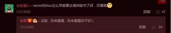 网友见吴尊参观澳洲学校,惊问:「这么早就要送NeiNei和Max出国留学吗?会不会很舍不得啊?」留言陆续追问「他们以后也要去澳洲读书吗」、「打算在澳洲上课了吗」、「他们两个那么小就要去澳洲读全寄宿学校了?」随后吴尊亲回:「没啦,先来看看,先来看看好不好。」