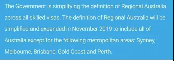 1、从今年11月起,在技术类移民签证中,偏远地区范围的定义被精简和扩大。新的偏远地区范围为除了悉尼,墨尔本,布里斯班,黄金海岸和佩斯的所有地方,具体邮编等信息会在稍后适当的时间公布。
