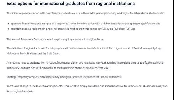 这个“二签”的申请条件比较简单,在上述新定义的偏远地区中,学习了本科以上的课程并且持有485签证,当你在485工作签证的两年中居住在偏远地区,你就可以符合资格申请额外一年的毕业生工作签证。