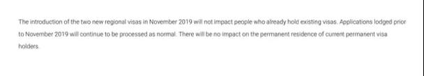 4、另外值得一提的是,本次政策的变更和推出,将不对现有签证有任何影响!不论你是489还是190。甚至于只要你在今年11月前递交签证,你的签证审理等仍然不受影响。