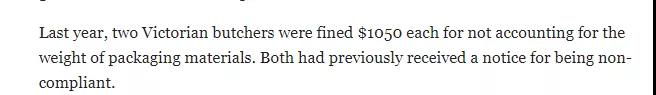 昆州的一名肉贩也被罚款,原因是大量预包装肉制品被发现重量少了8%,而同样来自昆州的一名肉类零售商今年4月被发现在三家商店出售重量不足的肉类。