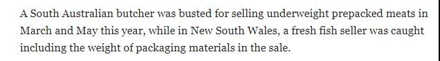 今年3月和5月,一名南澳的肉贩因出售重量不足的预包装肉而被逮捕,而在新州,一名鲜鱼商贩也因同样的问题而被抓。
