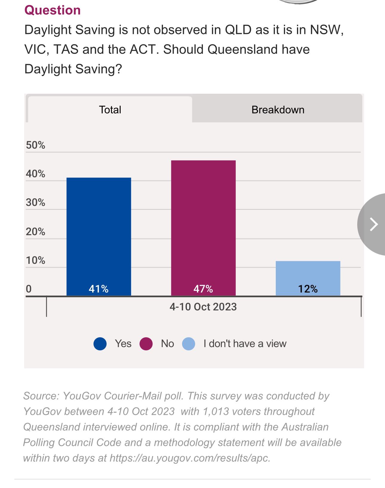 10月4日至10日期间对1013名昆士兰州人进行的YouGov民意调查显示,47%的人反对夏令时,41%的人支持,12%的人不太在意。