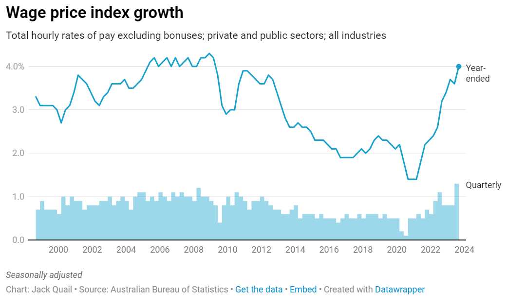 澳大利亚统计局周三表示,衡量一揽子代表性工作薪资率的工资价格指数在截至 9 月份的一年中加速至 4%,高于截至 6 月份的 12 个月中的 3.6%。