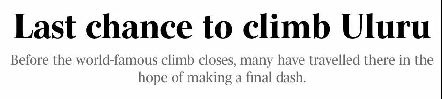 两周之后,闻名遐迩的乌鲁鲁巨石攀登步道即将关闭,不再允许游客攀爬。如果强制攀爬乌鲁鲁,会遭受到$60000以上的罚款并被判处两年监禁。