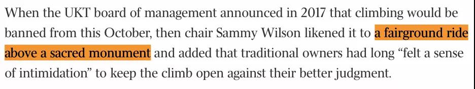 乌鲁鲁国家公园董事会主席Sammy Wilson将这种举动比作“圣碑上方的游乐场”。