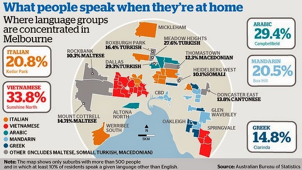 但这种情况正在改变。从2001年到2011年,由新移民带动,讲普通话的人从60万上升到100万。普通话现在已经成为内城区(包括CBD和Carlton)的第二大语言,而在富裕的Glen Waverley,有13%的居民在家中使用普通话。