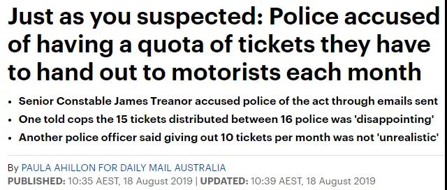 在墨尔本警方大举出动的时候,Daily Mail却突然爆出了一条新闻:警察必须每个月完成固定的罚款单数!