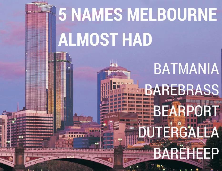 在最初几年,墨尔本有过很多称呼,包括Batmania, Barebrass, Bearport, Dutergalla, Bareheep ,以及最受欢迎的 "The Settlement" (定居点)。
