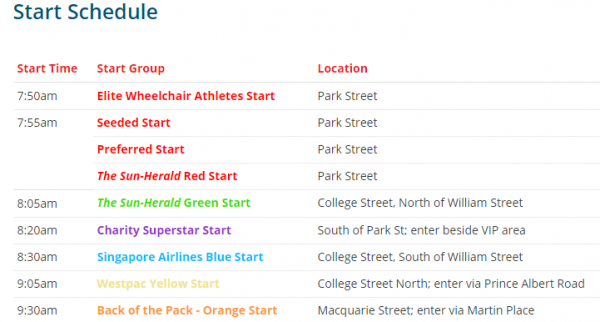 13日早上7:50,将由轮椅组Elite Wheelchair Athletes率先开赛,下图即为比赛开始时间表与开赛点地图: