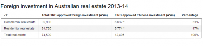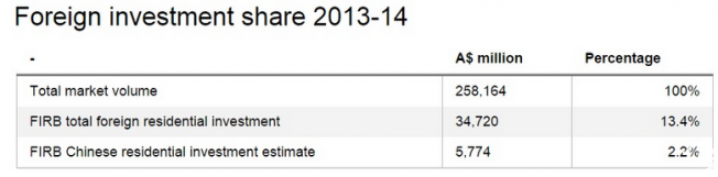 FIRB称,2014至2015财年,澳洲民用房地产的销售总额约为2580亿澳元,外国地产投资约为745亿澳元,其中经过审批的外国商业投资房产总额约为399亿澳元,外国民用房地产投资总额约为347亿澳元。然而,中国投资者只花了123亿澳元购置地产,比例约为16.51%,比澳人想象中的“半数房产都被中国人买去了”要低得多。