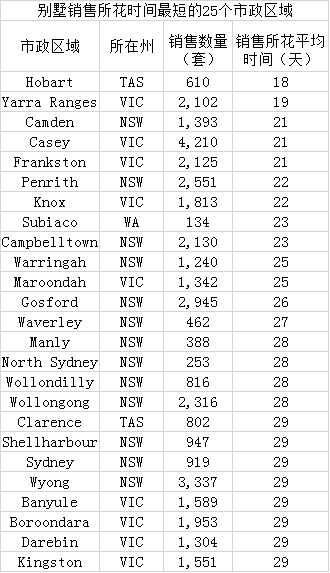 从以下“别墅销售所花时间最短的市政区域前25名”的图表中可以看出,销售数据的强劲绝大部分来源于澳洲最受欢迎的两大首府城市:悉尼和墨尔本。新南威尔士州、维多利亚州、西澳以及塔斯马尼亚以外的市政地区 都不在名单上。