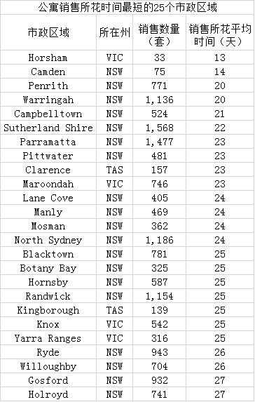 公寓市场的情况也差不多,房屋销售所需时间最短的市政地区前25名也几乎被悉尼和墨尔本占据。只有两个市政地区(塔斯马尼亚的Clarence和Kingborough)不在新南威尔士州或者维多利亚州,另外只有维多利亚州的Horsham不属于首府城市地区。