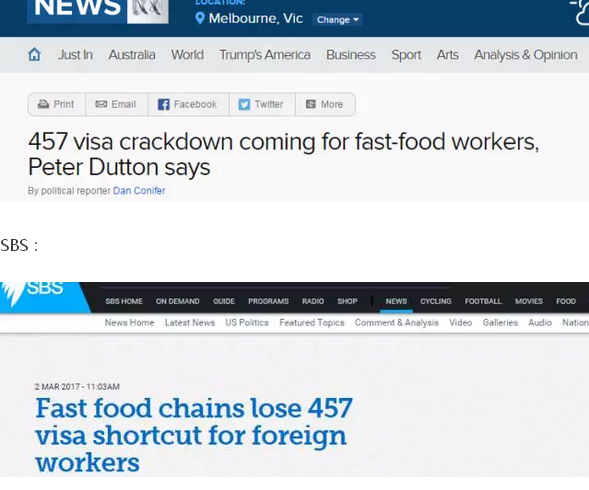 此项举措意味着,连锁快餐店将无法通过457签证未海外劳工提供担保!