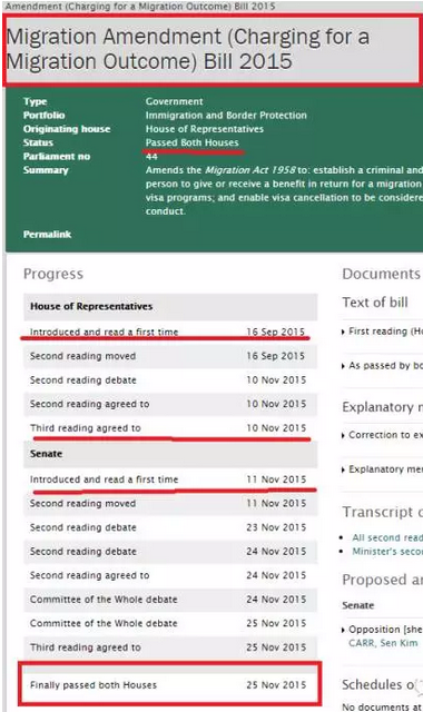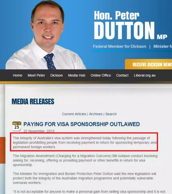 2015年底公布的《移民修正法案》(Migration Amendment)明令禁止"买卖"457签证,以提供签证担保为名索取、接受、提供钱款或输送利益将被视为违法行为。