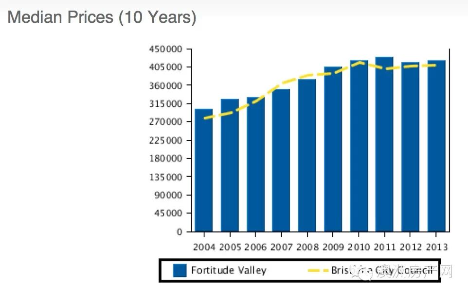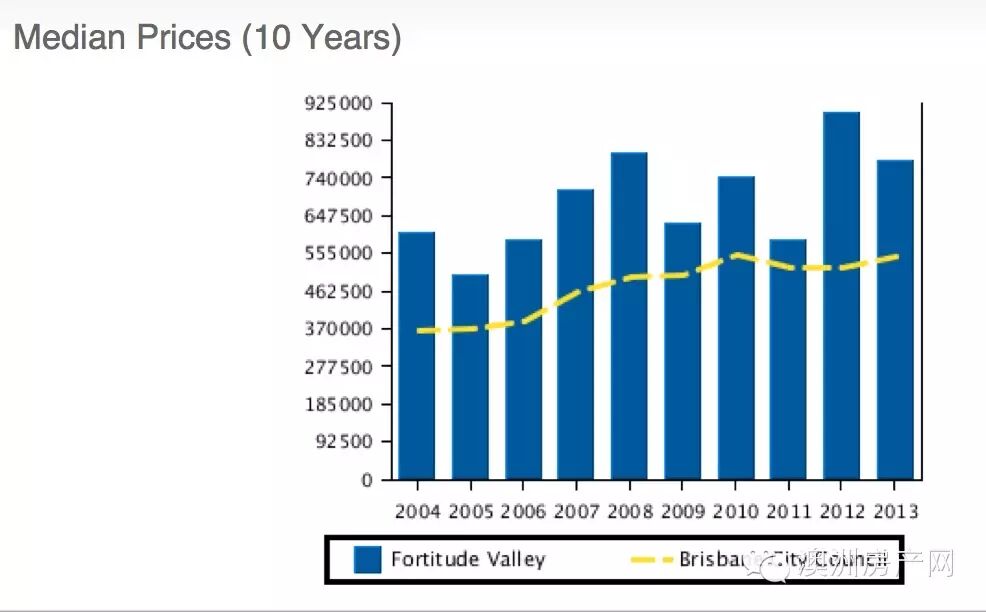 下图数据为FortitudeValley(猎人谷)从2004年—2013年别墅价格中值与布里斯班其他地区的比较图;可见,在过去10年,此区别墅的价格中值(蓝色柱状)均比布里斯班其他地区(黄色虚线)的价格中值高,虽然如此,别墅价格变化波动较大。不过,除FortitudeValley(猎人谷)以外,布里斯班其他地区均成稳步上升的良好状态。