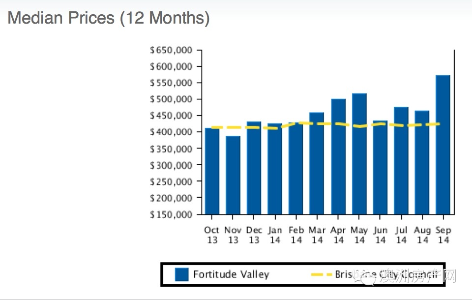 下图显示,从2013年10月到2014年9月,Fortitude Valley(猎人谷)公寓住宅价格中值均在$370,000以上。G20峰会在即,2014年9月,公寓价格中值更达到了全年新高。