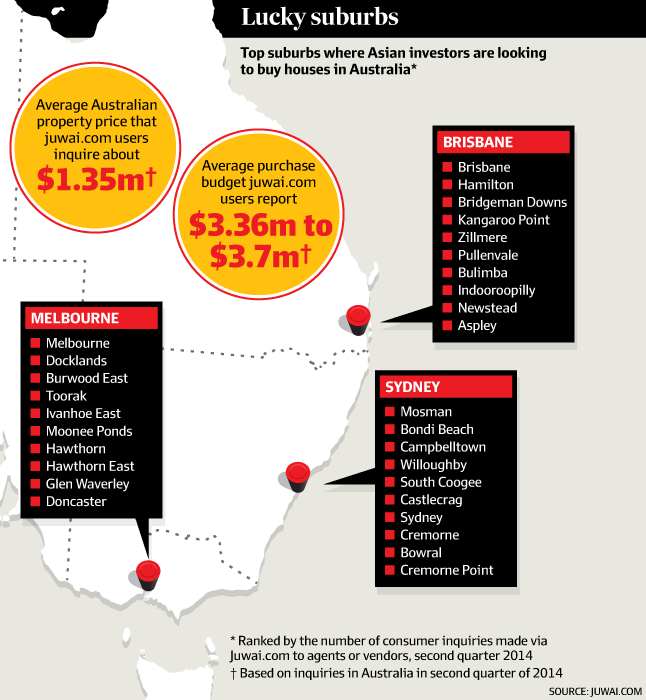 Juwai.com网站将悉尼的Mosman、Bondi Beach和Campbelltown列为中国买家的最爱,墨尔本的CBD、Docklands和Burwood East也入选。在布里斯班,中国买家热衷买CBD、Hamilton和Bridgeman Downs的房产。
