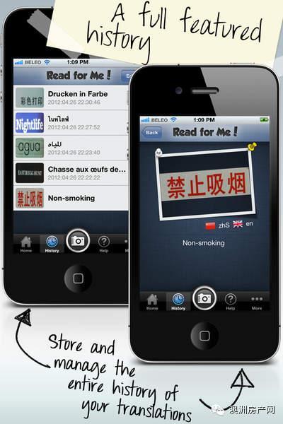 出国旅行时,识别路牌、菜单、打折信息等,总是不小的难题。可能连打字都无从下手,更别提翻译。现在,一款流行于欧美的革命性手机应用Read for Me!,可拍摄照片,直接翻译。能识别30种文字,并能翻译成36种语言,还提供18种语言的发音功能。