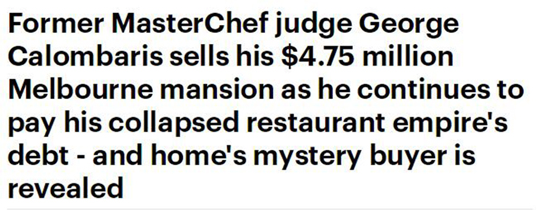 《每日邮报》援引《时代报》报道称,前《我要做厨神》真人秀裁判George Calombaris卖掉了其位于墨尔本Toorak的豪宅,买家是一名华人。
