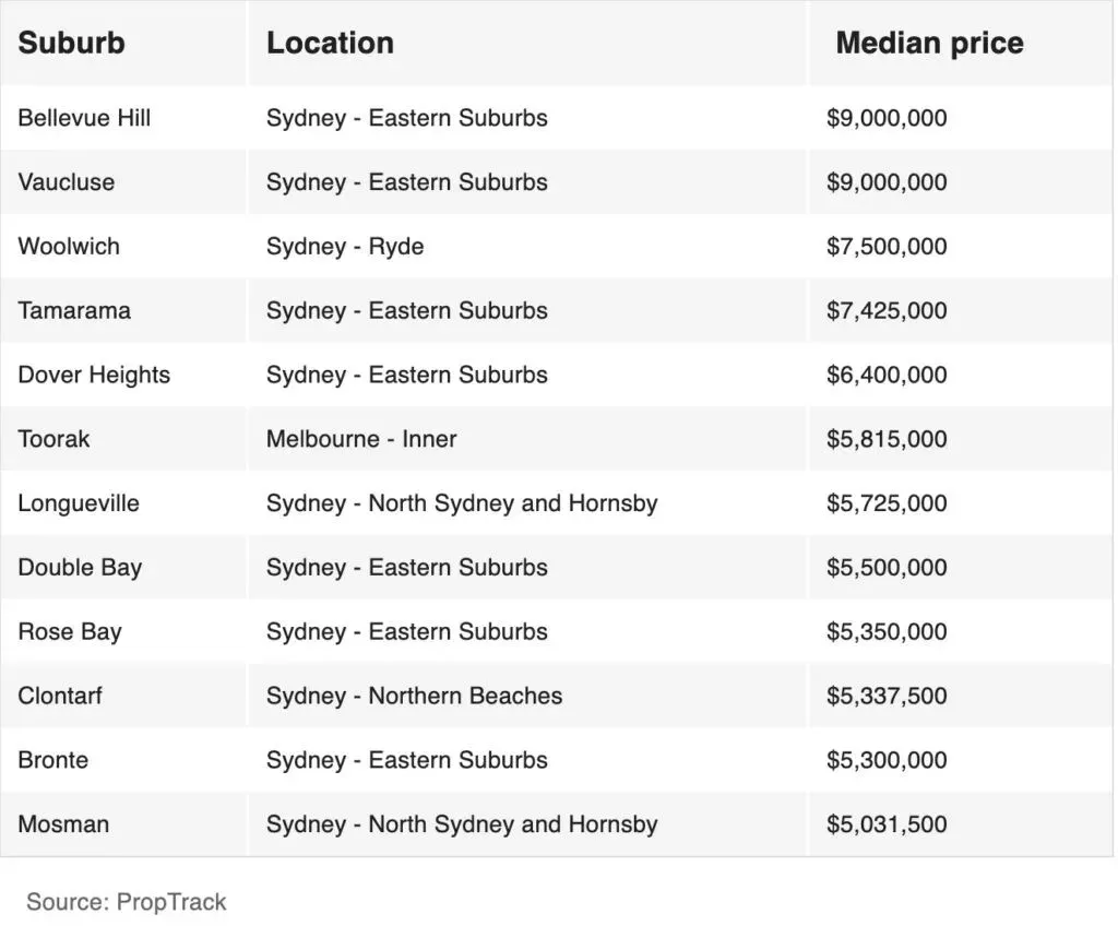 悉尼下北岸的 Woolwich(750 万澳元)、海滨 Tamarama(7,425,000 澳元)和 Dover Heights(6.4 澳元)也跻身前五。