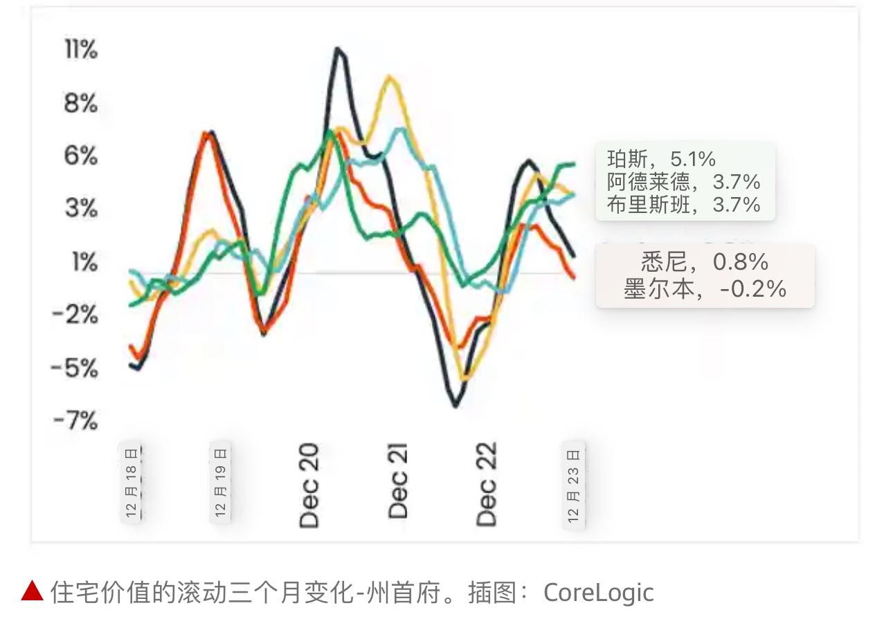 墨尔本在2023年底,最后两个月价格下跌,而仅在12月,悉尼价格就上涨了0.2%。根据CoreLogic的数据,珀斯、阿德莱德和布里斯班今年年底都创下历史新高。