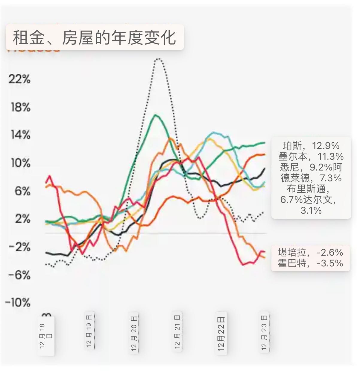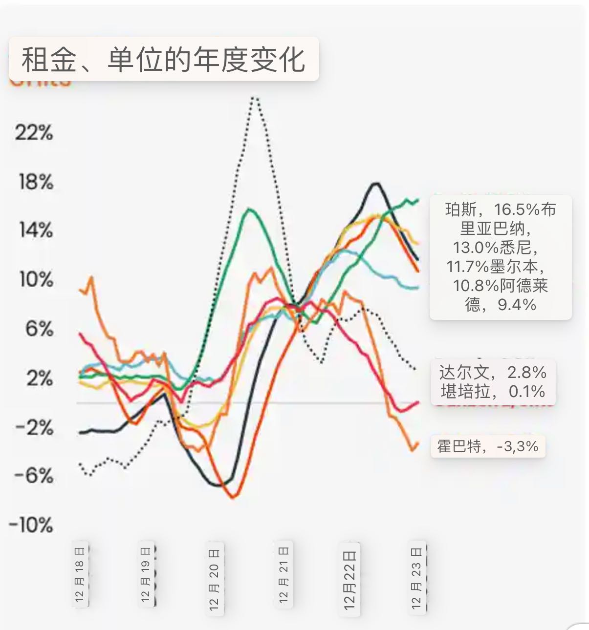 与购房一样,珀斯仍然是租金最紧张的市场。2023年,西澳大利亚州首府的单位租金上涨了16.5%,增加了80澳币的中位租金成本,而房屋租金上涨了12.9%,即每周约73澳币。霍巴特和堪培拉是租金下降的两个城市。
